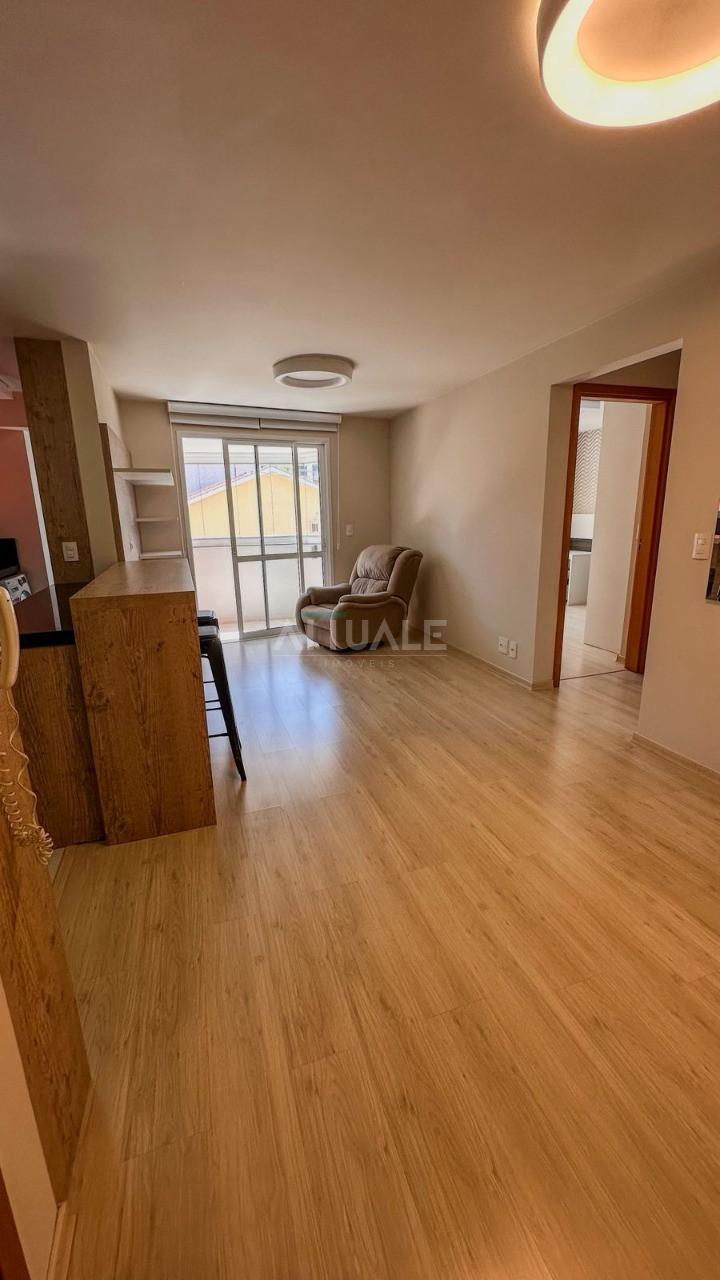 Attuale Imóveis aluga apartamento semimobiliado no Charqueadas, com ampla área social, sacada fechada, banheiro social, 02 dormitórios e um box duplo de garagem.