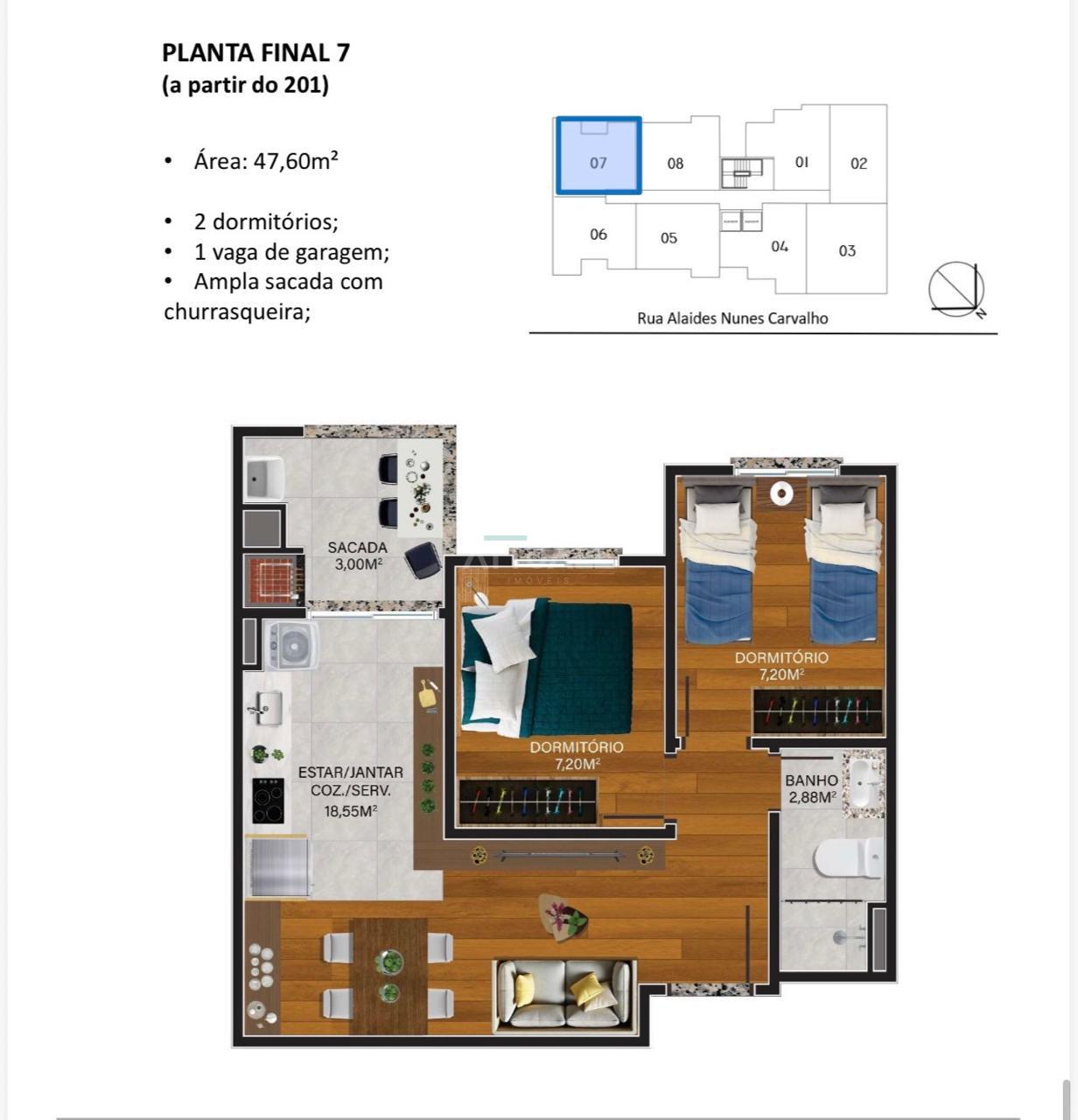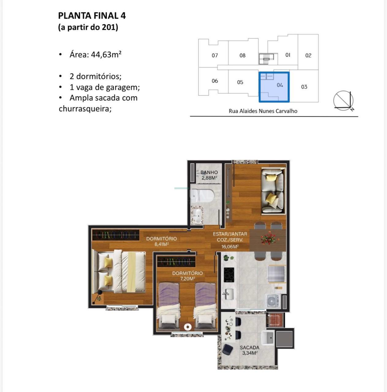 Attuale Imóveis vende apartamentos de 48,33m² a 61,34m² em construção, 02 dormitórios, sala de estar e jantar, banheiro social, sacada com churrasqueira, 01 vaga de garagem