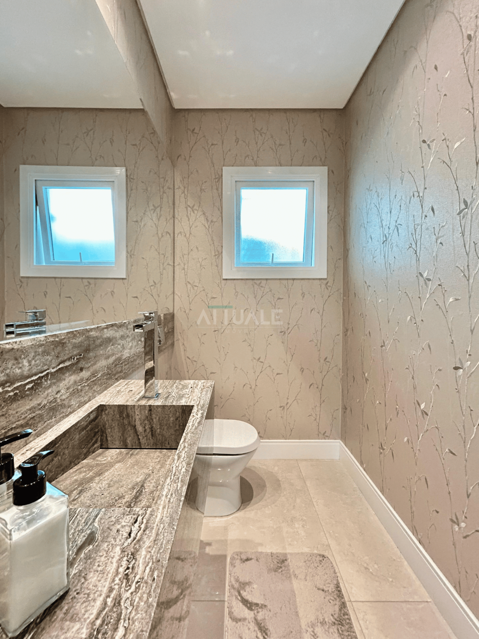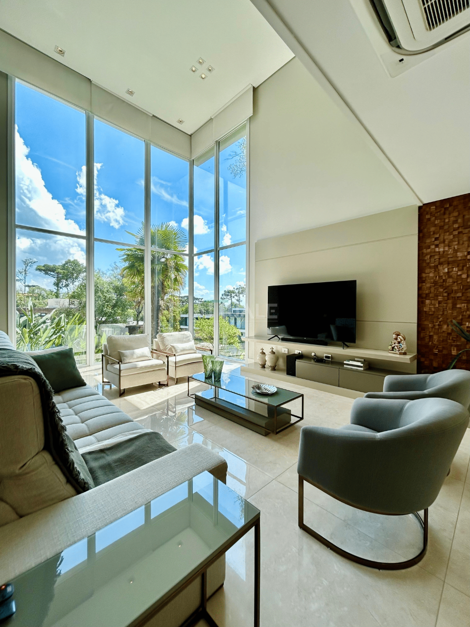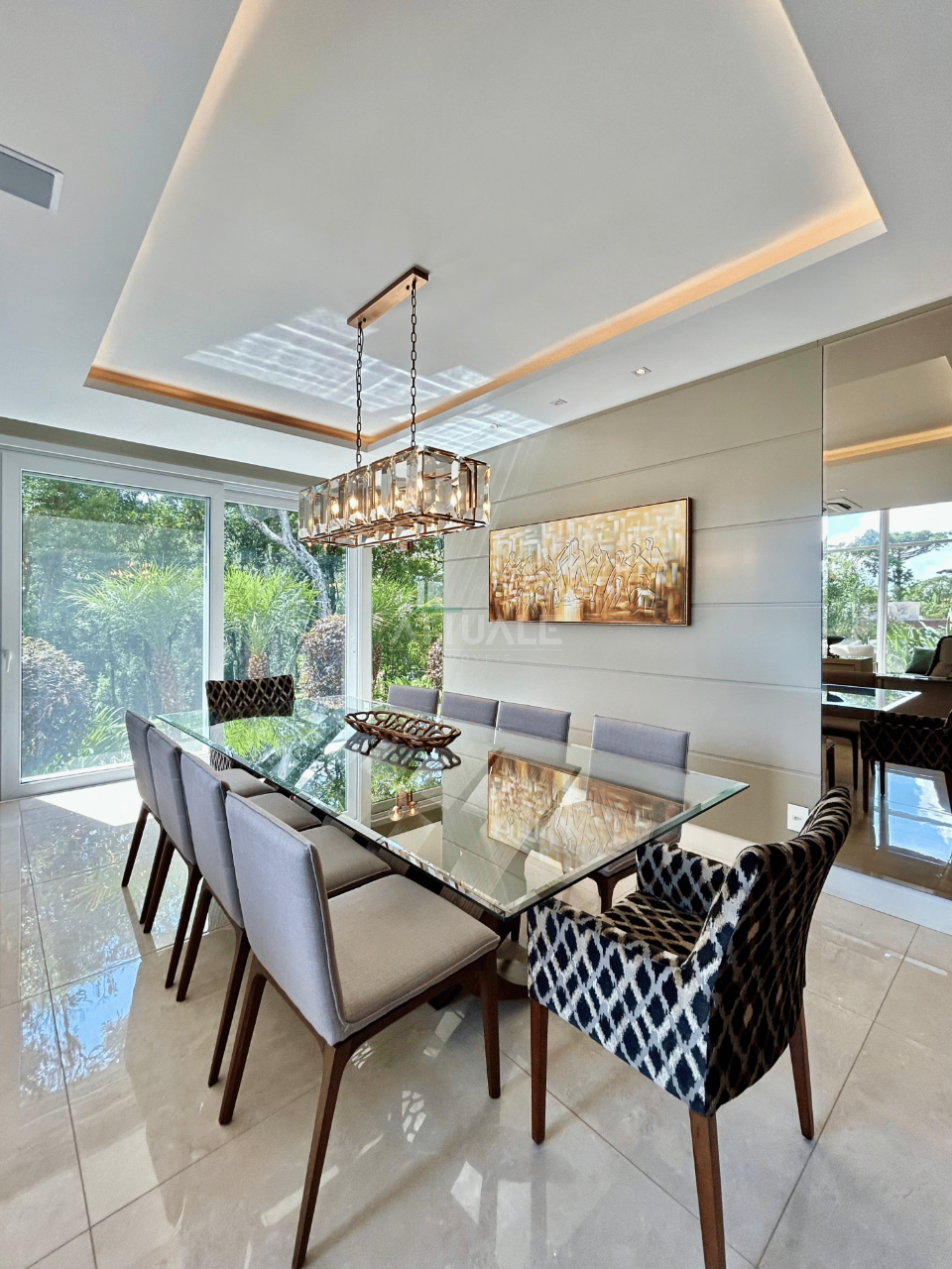 A casa conta com amplo living integrado em 3 ambientes, conectado à cozinha equipada com churrasqueira e bifeteira, proporcionando um espaço perfeito para receber e conviver. Possui ainda estar íntimo aconchegante com lareira italiana e estofado Natuzzi, além de lavabo.